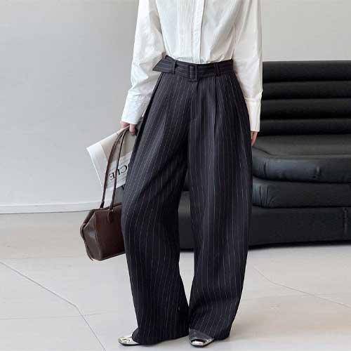 [유아몽드]핀스트라이프 핀턱 와이드 슬랙스 하이웨이스트 롱기