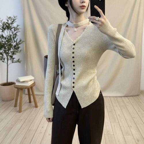 [다잇템]여성 골지 V넥 슬림 레이스 가디건