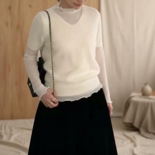 [옷자락]여성 벨벳 레이어드 프릴 시스루 목폴라 티