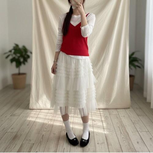 퓨어 시스루 펀칭 레이스 샤 허리밴딩 레이어드 캉캉 랩 미니스커트