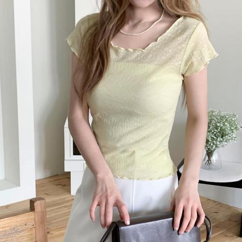 [옷자락]여자 데일리 데이트룩 여리핏 물결 시스루 라운드 반팔 티셔츠