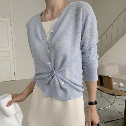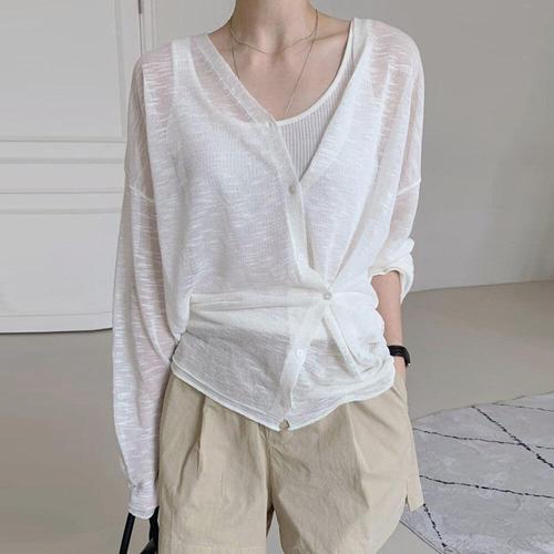 [유야]여성 시원한 얇은 시스루 옆단추 브이넥 가디건 -FVC0231- 봄 여름