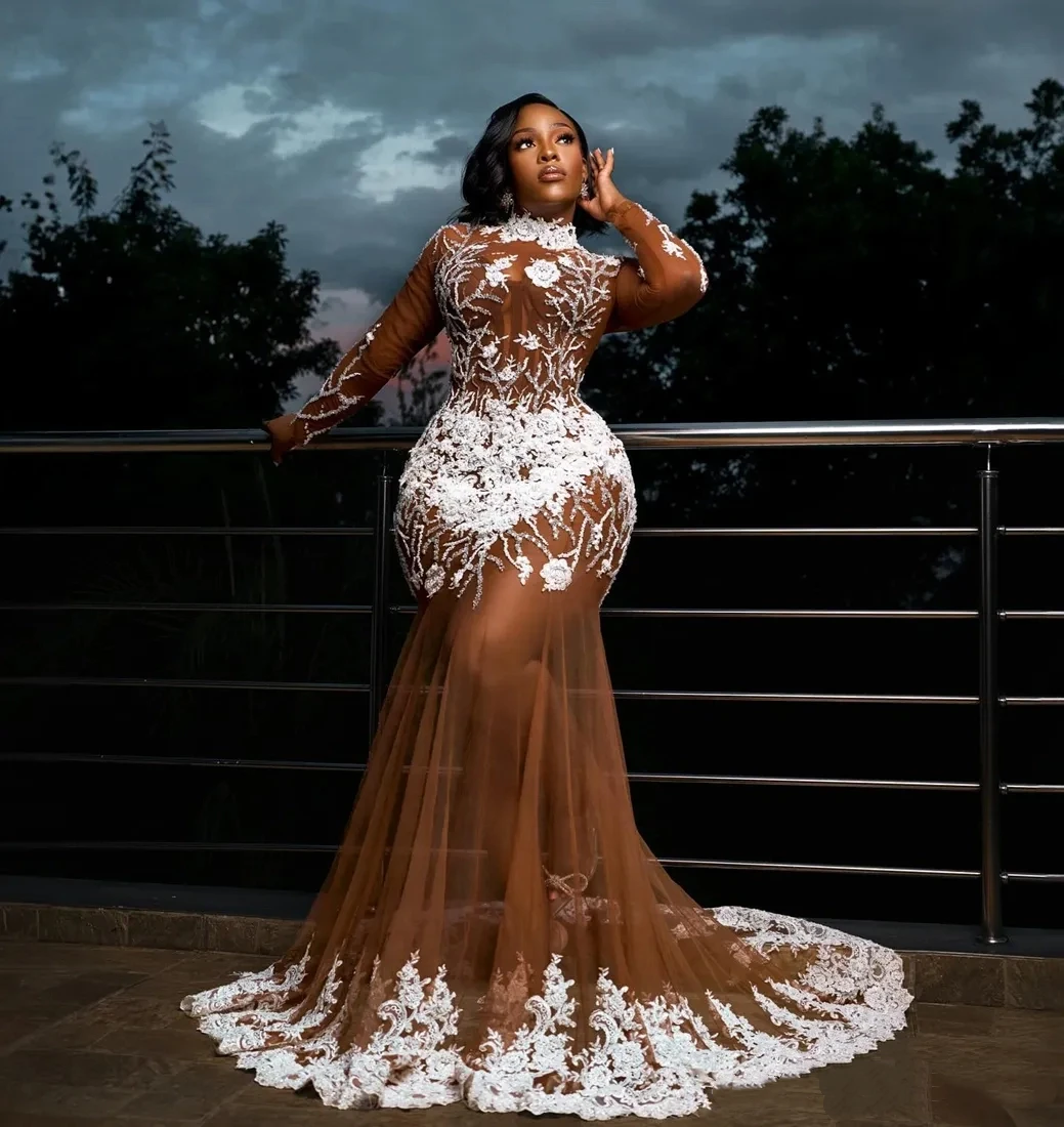 맞춤 제작 2026 머메이드 플러스 사이즈 블랙 여성 쉬폰 볼 드레스 특별한 날 일루젼 하이넥 데칼 정장 파티 드레스