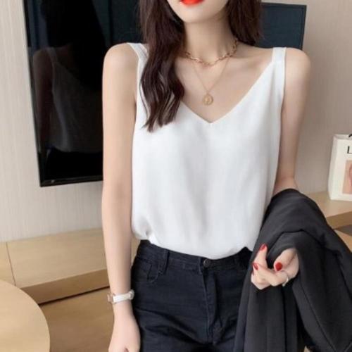 AOSSVIAO 2026 스파게티 스트랩 탑 여성용 홀터넥 V 넥 기본 화이트 캐미 민소매 새틴 실크 탱크 탑 여성용 여름 캐미솔