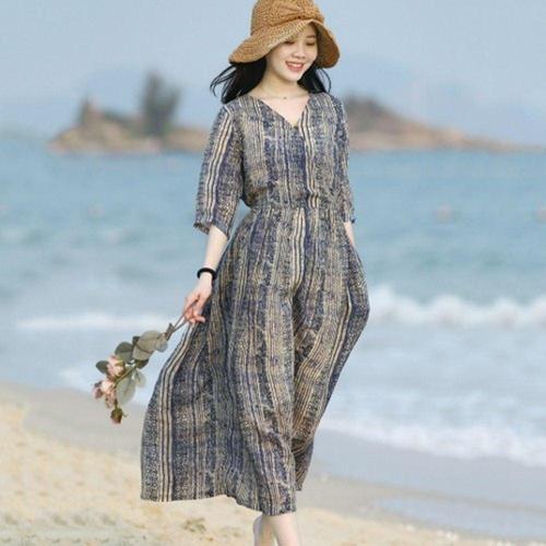 TEMU 신상 아웃도어 캐주얼 여성 비치 바캉스 민소매 원피스, 셔링 허리 & 포지셔닝 프린트 와이드 레그 팬츠 여성 점프수트