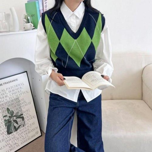 [오너클랜]인기상품 여성용 브이넥 레이어드 니트 아가일 패턴 루즈핏 조끼 2컬러 캐주얼 [WFLLCEA_260305]