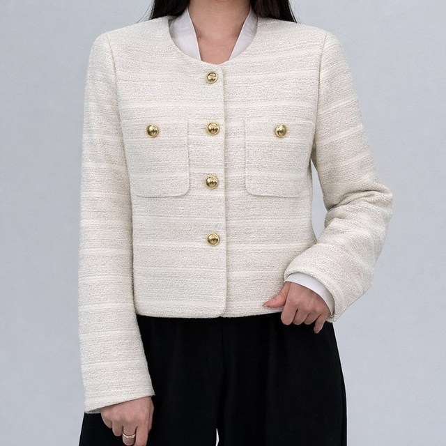 [샵앤]여성 노카라 클래식 심플 숏 탄탄 트위드 자켓 NYS-WJP-5147-아이보리