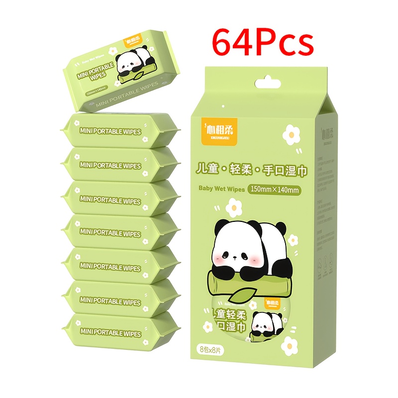 TEMU 64개 미니 휴대용 물티슈, 무알콜 일회용 물티슈, 여행용, 외출용, 남녀 공용, 애완동물 안전, 완벽한 선물용, 귀여운 판다 패턴