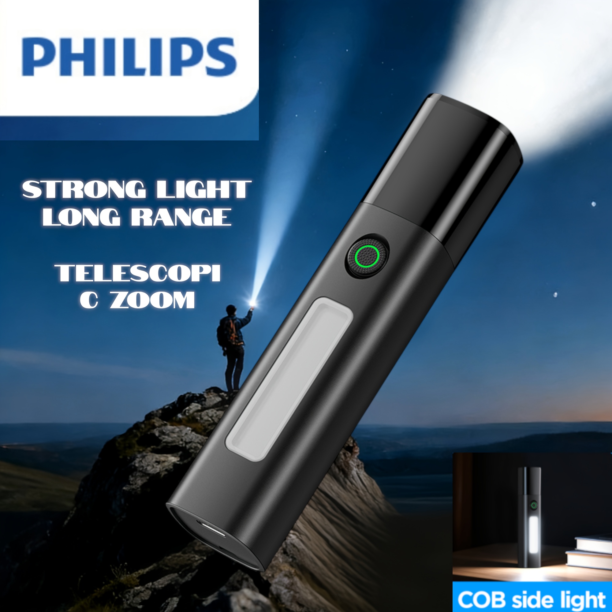 TEMU 필립스 고루멘 충전식 손전등 1개, 사이드 라이트 기능, 빔 초점 조절, 휴대하기 쉬운 컴팩트한 크기, 다단계 밝기 조절, 긴 배터리 수명, 가정용 비상/야외 캠핑/모험용으로 이상적