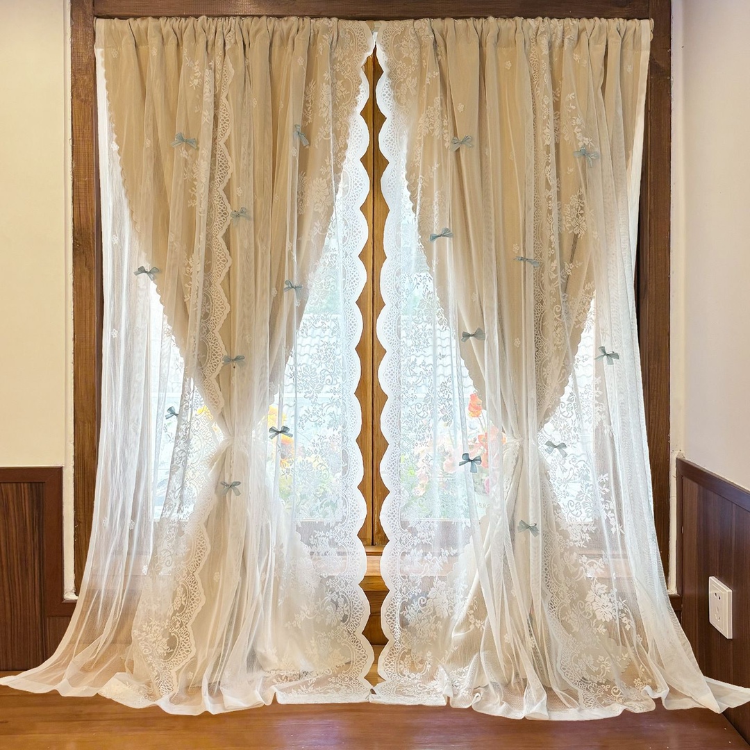 [해외] 이중 암막커튼 리본 레이스 커튼 공주커튼 벨크로 봉집형 선택