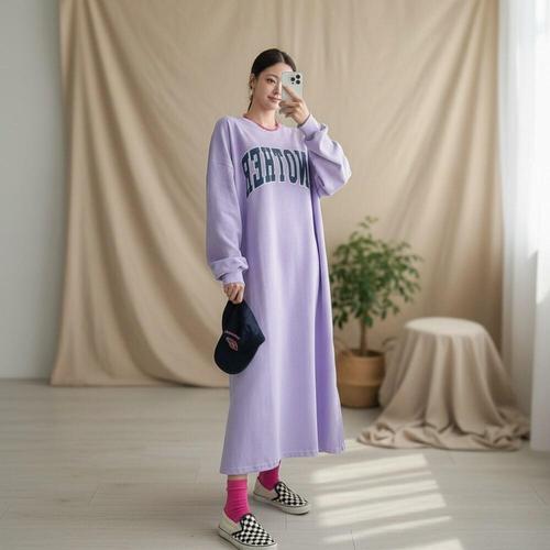 [옷자락]여성 보라색 레터링 롱 홈웨어 원피스 대형 양털 원피스