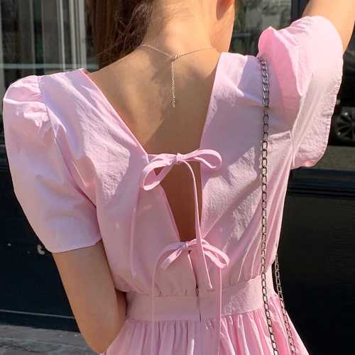 슈팅스타 / 에이라인 반팔 브이넥 백오픈 미디 롱 원피스