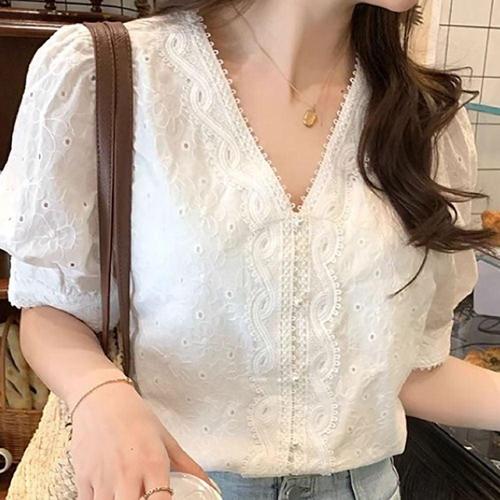 퍼프소매 브이넥 블라우스 화이트 여름 레이스 여성 반팔 WFKBX1H