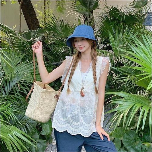 여성 레이스 자수 민소매 여름 블라우스 민소매블라우스