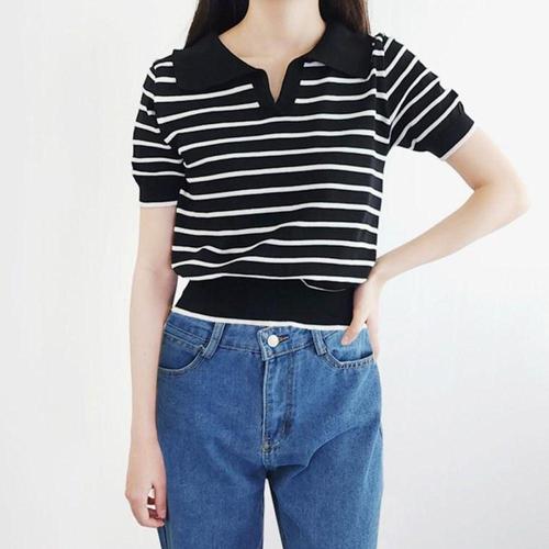 [오너클랜]인기상품 시원한 여름 여성 반팔니트 크롭니트 카라 스트라이프 니트티 [WFJ2B71_260227]