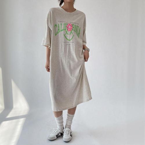 [더바디시크릿]빅사이즈 스마일 프린팅 반팔 롱원피스 여름 루즈핏 체형커버