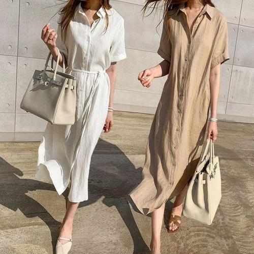 [에이치플러스몰]린넨원피스 셔츠 반팔 롱원피스 여름 루즈핏 데일리