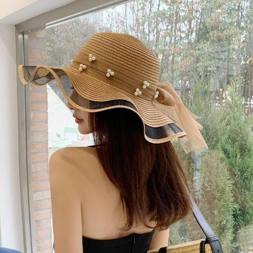 진주 장식 비치모자 여성 브라운 바캉스 밀짚모자 WFIXO8P