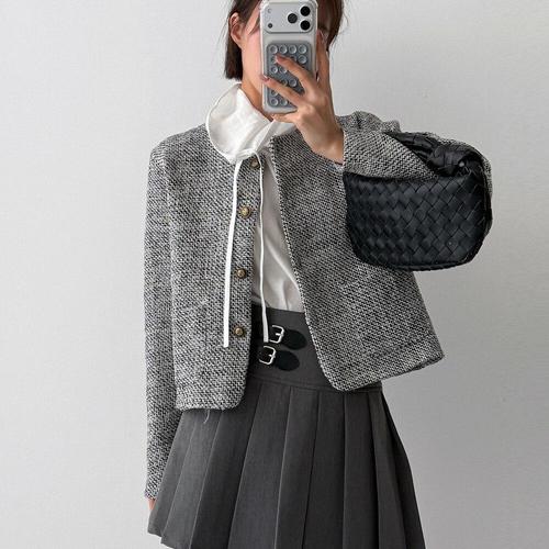 [옷자락] 여성 라운드넥 숏길이 어깨패드 트위드 재킷