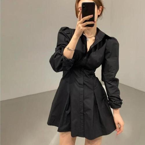 [옷자락]여성 핀턱 허리 볼륨 퍼프 소매 미니 원피스셔츠
