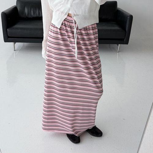 [신상오픈런]여성 H라인 스트라이프 와플 롱스커트 뒤트임