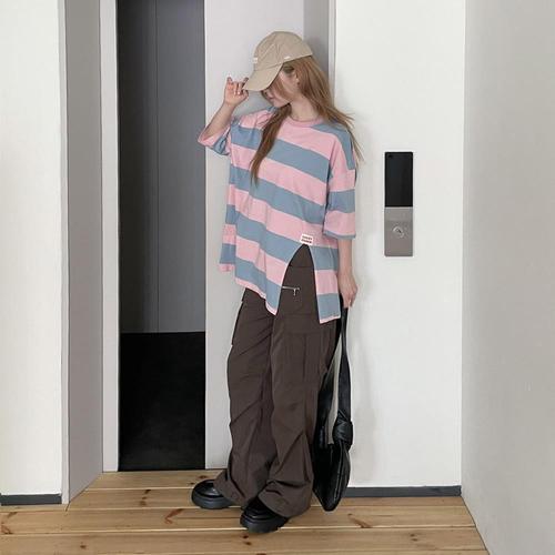 [옷자락]여자 코튼 오버핏 라운드넥 스트라이프 옆트임 반팔티