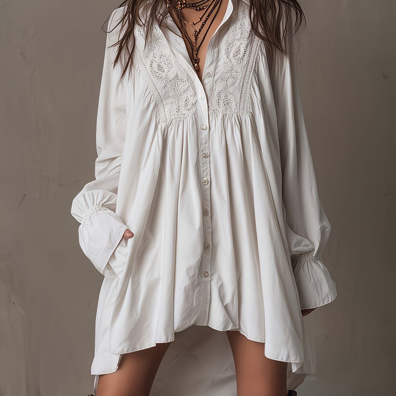 TEMU 2026 봄/가을 루즈핏 우아한 솔리드 컬러 버튼 탄성 커프 레이스 트림 화이트 셔츠 ZLLZ