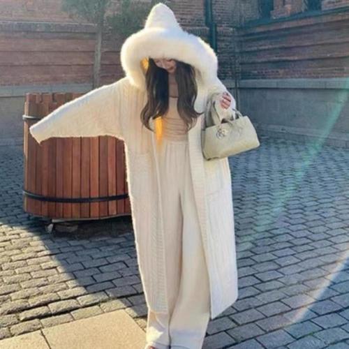 [옷자락]여성 오버사이즈 케이블 니트 후드 롱 가디건 무릎 길이