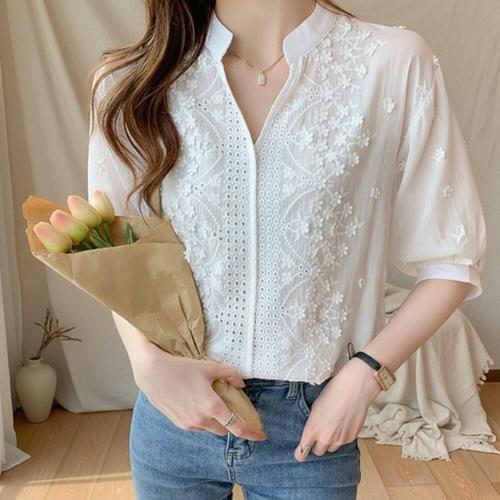 [옷자락]여성 면혼합 루즈핏 브이넥 꽃 자수 반팔 블라우스