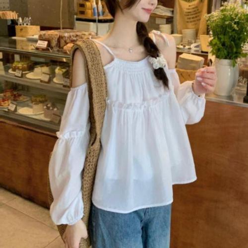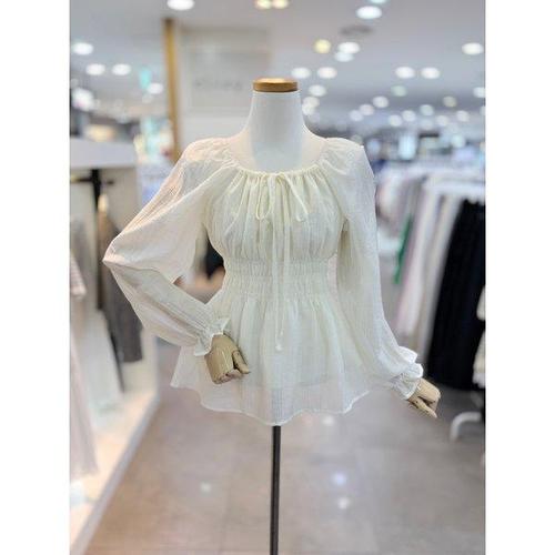 라라홀리 세미 오프숄더 청순 카라넥 허리 셔링 긴팔 셔츠