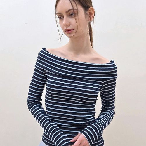 스트라이프 오프숄더 티셔츠