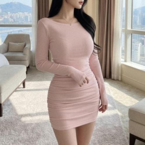 [옷자락] 여성 골지 긴팔 보트넥 셔링 뒷리본 슬림핏 미니드레스