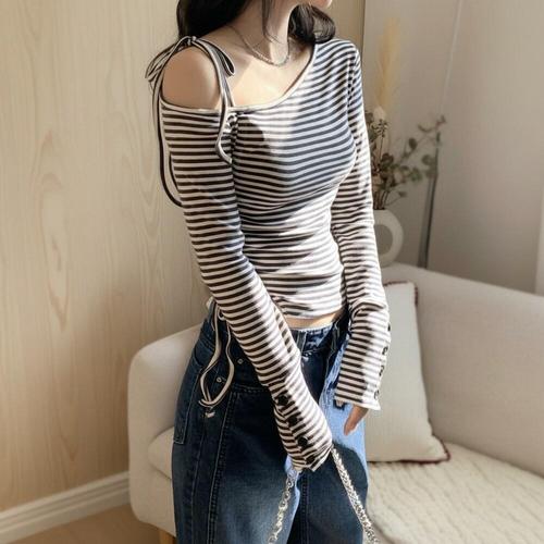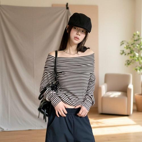 [옷자락]여성 오프숄더 스트라이프 크롭 긴팔 티셔츠