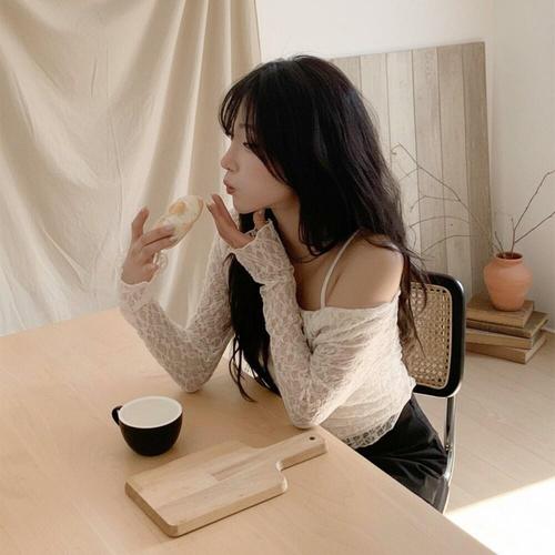 [옷자락]여성 레이스 시스루 오프숄더 폴리 티셔츠