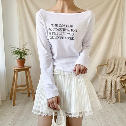 [옷자락]여성 셔링 어깨 보트넥 긴팔 무채색 데일리 티셔츠