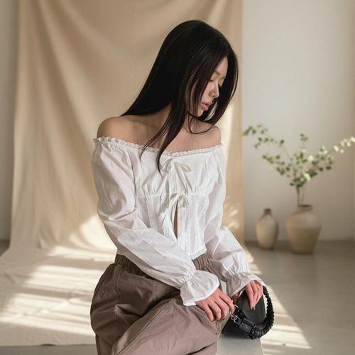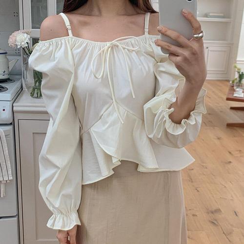 [SBD] 블라우스 프릴 앞 스트링 오프숄더 뒤 어깨 소매벌룬