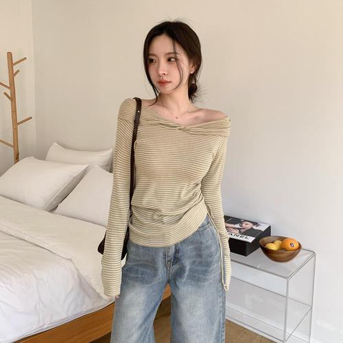 [하프클럽/]여성 슬림핏 홀터넥 스트라이프 레이어드 오프숄더 티셔츠