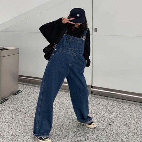 데님멜빵바지 오버롤 청 여성 멜빵바지 와이드핏 점프수트 데님