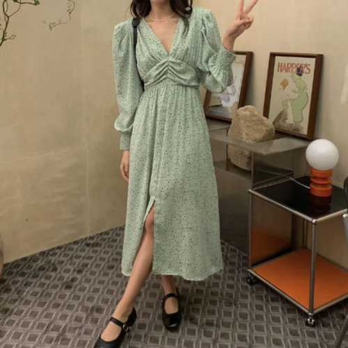 슈팅스타 / 아우한 브이넥 셔링 어깨패드 절개 시폰 원피스