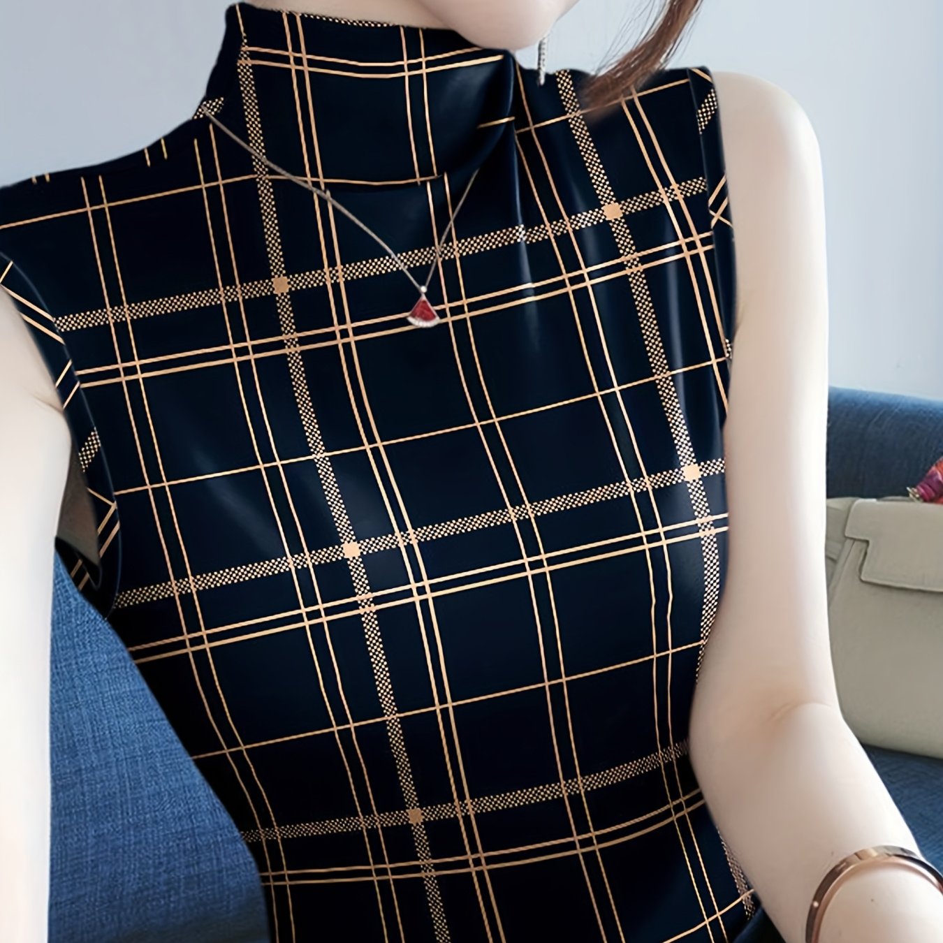 TEMU 여름용 하이넥 프린트 여성 신상 캐미솔, 스타일리시 슬림핏 베이스 레이어, 우아한 민소매 탑