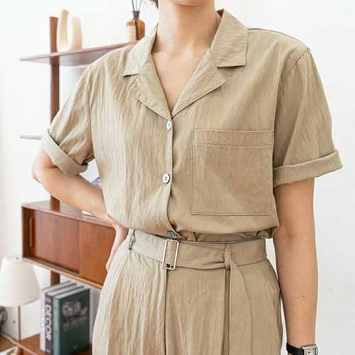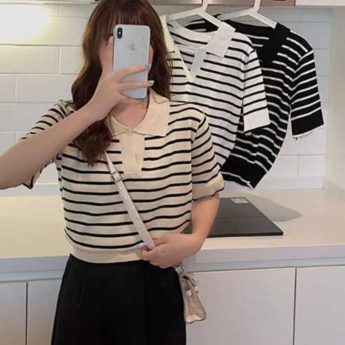 주말 외출 나들이 코디 여자 반팔 니트 카라 버튼 넥 WFL7SN3