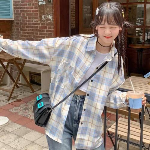 실용적인 포켓 디테일 오버핏 여성용 캐주얼 체크셔츠 WFK0BC4