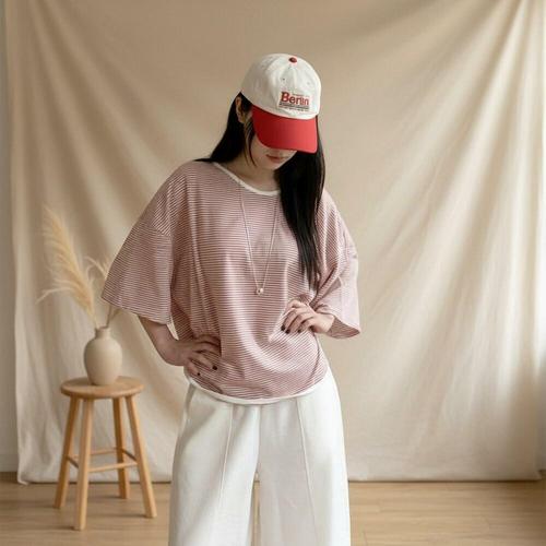 [다잇템]여성 줄무늬 와이드소매 돌만 라운드 티