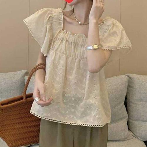 [에이치플러스몰]스퀘어넥 펀칭 프릴 블라우스 퍼프소매 여름 데일리