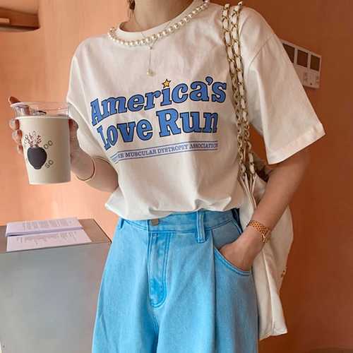 슈팅스타 / 진주장식 레이어드 레터링 루즈핏 캐주얼 반팔티