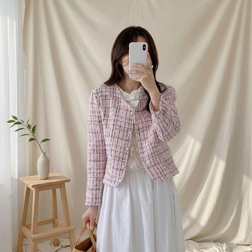 [신상오픈런]봄 하객룩 여성용 핑크 트위드 자켓 진주 버튼 벚꽃 스타일