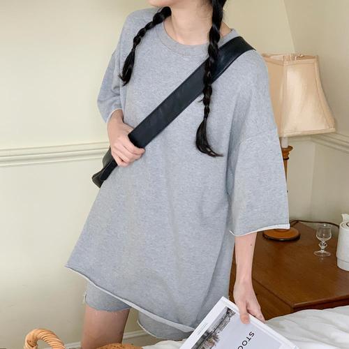 [옷자락] 여자 라운드넥 밑단 컷팅 쭈리 반팔 반바지 세트