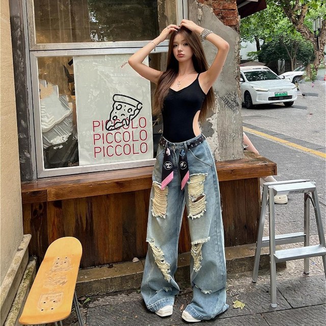 [신상오픈런]여성 뒷밴딩 찢청 와이드핏 워싱 데일리 청바지