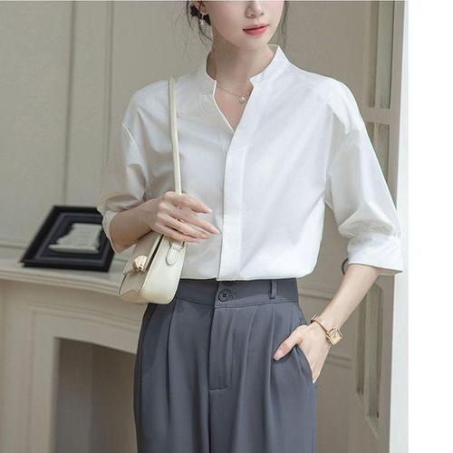 ASURE 여 봄 차이나 루즈핏 캐주얼 벌룬 소매 솔리드 셔츠