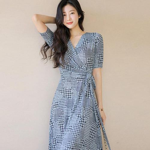 [스타일온미][스타일온미] 랩 디자인 A라인 롱 플레어 밑단트임 하운드체크 원피스